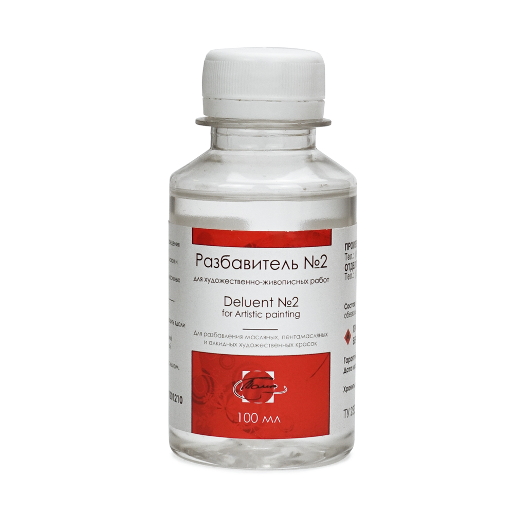 Предназначен для разведения масляных, пентамасляных и алкидных художественных красок, разбавления лаков и жирных масел. Может использоваться для очистки от масляных красок кистей и палитр. Состав: отфильтрованный обезвоженный уайт-спирит.